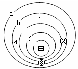 1.若此图为树桩年轮示意图,下列说法正确的是2.若a、b、c、d、e为等时线(汽车从甲点出发向外行驶所用时间相等点的连线),则