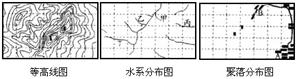 2、单选题 下面分别为同一地区等高线图、水系分布图、聚落分布图。读图,完成1—2题。