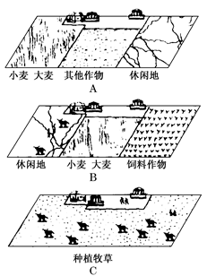 (1)读图分析,A阶段农业生产以种植业为主。B阶段是混合农业。C阶段主要是种植牧草,所以是乳畜业为主。