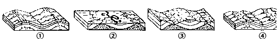 1、关于图中地貌成因叙述正确的是 [? ] A.图①中地势的起伏是外力作用的结果 B.图②中由于流水搬运作用形成冲积平原 C.图③中谷地主要是流水侵蚀而成 D.图④中地貌反映了“背斜成谷,向斜成山”的现象 2、图中四种地表形态是随时间的发展而变化的,其地貌形成顺序的正确排序是 [? ] A.①②③④ B.①④②③ C.③④②① D.①④③②