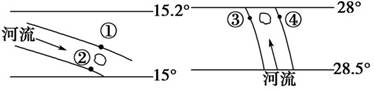 ③根据水平运动的物体受地转偏向力的影响,偏转的规律判断侵蚀岸与沉积岸,侵蚀岸被冲刷,沉积岸泥沙沉积。