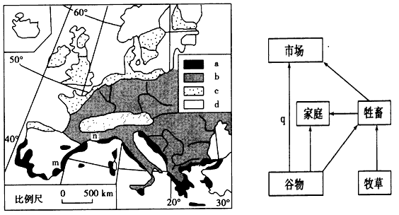1、单选题 左图为欧洲四种农业地域类型分布图,右图是该区域某种农业地域类型的经营方式示意图。读图回答1~3题。