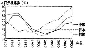 A.①②③④ B.④③②① C.④①②③ D.③②①④ 4、单选题 读中国、日本和韩国人口负担系数百年比较图 [注:人口负担系数:(14岁及以下人口数+65岁及以上人口数)/(15~64岁人口数)×100%],回答问题。 |