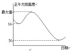 小题2:若图中M、N的数值相差20度,即太阳直射北回归线与南回归线时的正午太阳高度相差20度,所以该地与南、北回归线之间的纬度差的差值是20度,可以算出该地位于10度纬线,A对。B、C、D错。