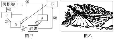 2、单选题 下图中,图甲表示地壳物质循环过程,序号表示地质作用;图乙为某种地貌景观图。读图完成下列各题。