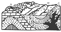 2、单选题 下图中,图甲表示地壳物质循环过程,序号表示地质作用;图乙为某种地貌景观图。读图完成下列各题。