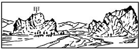1.图示甲位于河流上游,为流水侵蚀地貌。