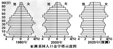 1.该国人口变化趋热的一个突出特征是 [? ] A.年轻劳动力过剩 B.老龄化趋势显著 C.自然增长率上升 D.人口出生率较高? 2.示意图显示,该国人口平均寿命状况是 [? ] A.平均寿命延长,女性长于男性 B.平均寿命延长,男性长于女性 C.平均寿命缩短,女性长于男性 D.平均寿命缩短,男性长于女性 3.人口金字塔示意图所示的亚洲某国,最可能是? [? ] A.中国 B.日本 C.印度 D.泰国