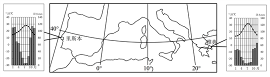 【小题1】根据气温曲线图分析可得,两地夏季的气温有差异,里斯本夏季气温低于雅典。影响气温的主要因素有纬度(太阳辐射)、海陆位置、地形、洋流等。两地所处的纬度位置相当,距离海洋都较近,都位于沿海平原地形,所以纬度、海陆和地形因素不是造成其差异的原因,里斯本附近受寒流的影响,所以夏季气温低于雅典。