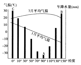 5、单选题 下图是“沿40。纬线某大陆1月、7月温度变化曲线及各地年降水量分布图”,读图完成1~2题。