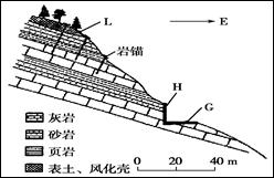 2、单选题 某段高速公路(G)经过单面山(顺向山)地区,地质剖面如下图所示。为防止地质灾害发生,对施工立面H进行了加固,还在L坡面上打入“岩锚”,以固定表层岩层。完成问题。