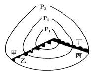 【小题2】根据图示的锋面分布,锋面附近的降水始终出现在冷气团一侧,图示为北半球的锋面气旋,故判断冷空气位于北面,故判断甲、丁应为雨区位于,故乙地和丙地在暖气团控制下,则天气晴朗。