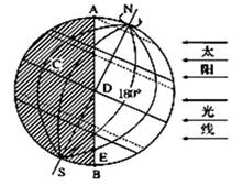 2、单选题 读图,A、B、D、E三点在晨昏线上,据此完成问题。