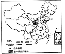 参考答案:(10分) (1)2010年产品销售上内销和出口并重,1999年产品以内销为主。(2分) (2)太阳辐射强,光照充足;气温日较差大;劳动力廉价;土地价格低(4分) (3)降水少,水资源贫乏(1分) (4)技术、信息优势(2分) (5)C(1分)