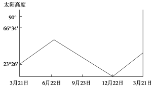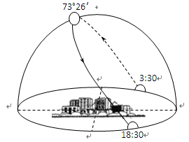 1、单选题 读某地大阳视运动图(图中73°26′为一年中最大正午太阳高度、图中时间为太阳在地平线上的北京时间),回答小题。