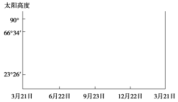 本题解析: (1)当地球公转到A位置时,太阳直射在北回归线上,北极地区为极昼,可以得出乙图中左侧为昼半球,右侧围夜半球,顺着地球自转方向,经过PM,地球由夜半球进入昼半球,所以PM是晨线,经过MN,地球由昼半球进入夜半球,所以MN是昏线。地球自转方向与公转方向相同,所以应在乙图中画逆时针方向的箭头。 (2)根据上题分析P为晨线和赤道的交点,地方时为6:00,Q点位于P点西侧,经度相差45°,而且位于晨线上,正在日出,所以Q点日出地方时为3时,Q地的昼长为(12:00-3:00)×2=18小时;这一天太阳直射在北半球,所以日落方位是西北,日落时直立物体的影子指向东南。 (3)当地球共转到C位置时,太阳直射在南回归线上,所以北半球昼短夜长,且纬度越高昼越短、夜越长,北极圈及其以北发生极夜现象;南半球昼长夜短,且纬度越高昼越长、夜越短,南极圈及其以南发生极昼现象;赤道上昼夜平分。 (4)M点位于北极圈上,当3月21日太阳直射在赤道上时,北极圈上的正午太阳高度为90°-66°34′=23°26′,随后随着太阳直射点北移,正午太阳高度逐渐增大,6月22日。太阳直射在北回归线上时,正午太阳高度达一年中最大值90°-(66°34′-23°26′)=46°52′,此后,太阳直射点南移,正午太阳高度逐渐减小,直到12月22日,太阳直射在南回归线上,正午太阳高度达一年中最小值90°-(66°34′+23°26′)=0,之后随着太阳直射点北移,正午太阳高度再逐渐增大。