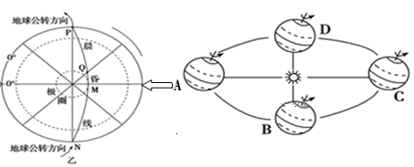 4、综合题 读地球公转和自转运动示意图(乙图对应A位置),回答下列问题。(10分)