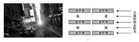 2、单选题 每年的5月30日前后,日落时的金色阳光洒满美国纽约曼哈顿(西五区)的所有某走向的街道,呈现一幅壮观的景象,即“曼哈顿悬日”现象(左图)。右图表示此时阳光与街道的位置关系。据此回答下列各题。