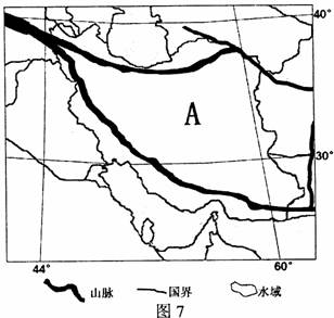 材料二? A高原是一个相对闭塞的高原,周围山地海拔多在3000m以上,中部高原与盆地海拔多在900m~1500m之间。其气候特点是温差大,雨量少,年降水量的75%集中于1~4月,为冬雨型气候。除高原边缘的迎风多雨的山地有森林外,其余区域主要为荒漠或草原植被。