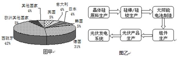 5、单选题 光伏发电是将光能直接转变为电能的一种技术,关键元件是太阳能电池,产业链的产品具有轻、薄、短、小的特点。图甲是2011年世界太阳能光伏发电量比例图,图乙是太阳能光伏产业链示意图。读图完成下列各题。