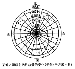 3、单选题 某校地理小组,根据当地各朝向楼房外墙面接受太阳辐射热量的实测值,计算出一月和七月的太阳辐射热日总量,并绘出图。结合图示信息完成1~2题。