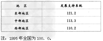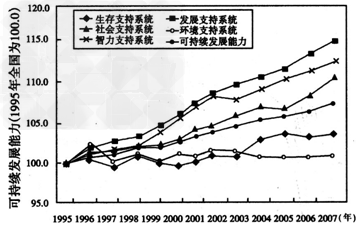 中国科学院构建的中国可持续发展能力评估体系。由生存、发展、环境、社会和智力五个支持系统组成。其中生存支持系统与生存资源禀赋(土地资源、水资源、气候资源等)、农业收入水平、资源转化效率等有关,发展支持系统与区域发展水平(区域产业结构等)、区域发展成本等有关。下图是1995~2007年中国可持续发展能力变化趋势图,下表是2007年中国东、中、西部发展支持系统评估表。