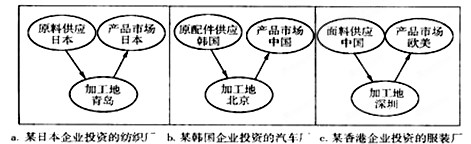 小题2:A工厂的原料来自日本,中国加工,市场不在中国,而是日本。说明中国只是负责加工,显然是为了降低劳动力成本而到中国加工,故A的区位因素是劳动力;B图显示原料配件全部来自韩国,在中国加工,而市场是面向中国的,说明这个汽车厂之所以到中国来生产,是因为中国有着巨大的汽车消费市场,因为汽车产业不是劳动密集型,故它的区位选择是看好中国的市场。C图显示香港的企业利用大陆的原料,并且在中国加工,而市场是面向欧美市场,说明它来大陆建厂的区位是资源或原料和劳动力。故选D。