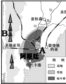 (1)图中主要农业畜牧区为阿根廷的著名?草原,是目前世界上主要的?(畜产品)出口基地。 (2)A城市的名称是?;B是世界上最长的?山脉。该大陆西侧是?洋;大陆东侧是?洋。 (3)该地区畜牧业的发展,为我国内蒙古牧区提供了哪些可以借鉴的经 验:??;? ;?。