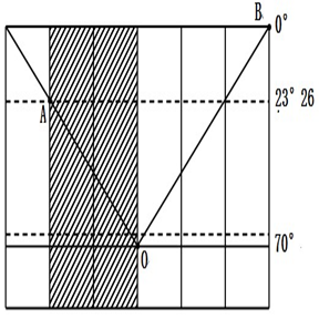 4、综合题  该图中AO和BO为晨昏线,阴影所在的经度范围与全球其他地区日期不同。读图回答问题。