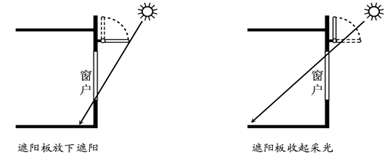 3、单选题 余姚某中学研究性学习小组,设计了可调节窗户遮阳板,实现教室良好的遮阳与采光。下图示意遮阳板设计原理,据此回答下列问题。