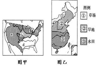 | 小题2:图甲中b处的粮食生产与图乙中的哪处相似(? )? A.① B.② C.③ D.④