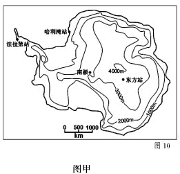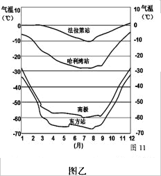 3、单选题 读“南极洲等高线图”(图甲)和“南极洲四个气象站气温曲线图”(图乙),回答1—2题。