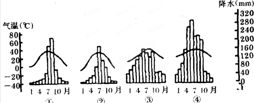 4、单选题 下图是我国四个地方(①一④)的年内各月气温与降水量图。四地均位于平原,且受东部雨带影响。读图回答小题: