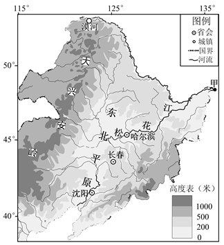 小题1:图中 A.甲地是中国日出最早的地方 B.夏至日漠河有极昼现象 C.大兴安岭为内、外流区分水岭 D.松花江干流有凌汛现象