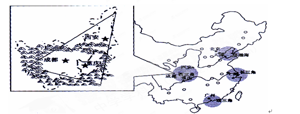 材料一:规划建设的“西三角经济区”包括重庆经济图、成都经济圈和以西安为中心的关中城市群,将打造成继长三角、珠三角、环渤海经济区之后的我国经济第四增长极。?