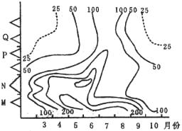 3、单选题 下图所示是我国东经110°以东地区的月等降水量线分布状况,M、N、P、Q分别代表不同纬度带的四个地区,根据图中提供的信息,完成下列问题: