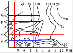3、单选题 下图所示是我国东经110°以东地区的月等降水量线分布状况,M、N、P、Q分别代表不同纬度带的四个地区,根据图中提供的信息,完成下列问题: