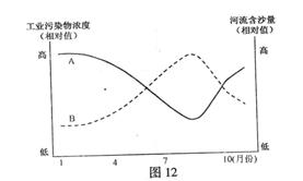 2、综合题 如图12,黄河中游沿岸某城市附近河段河流水质(河水工业污染物浓度及含沙量)季节变化明显。据此回答:(5分)