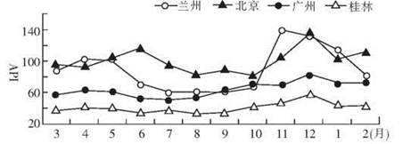 材料二 我国空气质量周报采用空气污染指数(API)的形式报告。API越大,表示污染越严重,空气质量越差。监测的项目主要有:TSP——总悬浮颗粒物、SO2——二氧化硫、NOx——氮氧化物等。下表为我国冬季某日部分城市空气质量指标资料。
