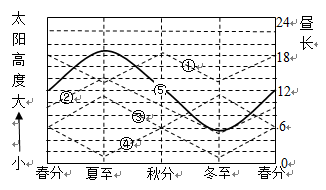 3、单选题 图中①②③④4条折线表示四地正午太阳高度的季节变化情况,⑤曲线表示四地中的某地昼长随季节变化的情况。据此回答下列各题。