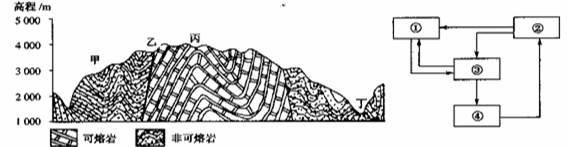 1.甲、乙、丙、丁处,地质构造相同的是2.丙处岩石的成因与右图地壳物质循环图中数字代表的岩石相符的是3.随着气候变暖,自丁至丙地自然带呈现的变化最有可能是