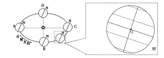 (1)在甲图中用字母M标出直射点、用箭头表示太阳光线(光线画在甲图左侧)、用阴影表示夜半球。(6分) (2)简述地球由B位置公转到C位置过程中,甲图中M点正午太阳高度及昼夜长短的变化特点(6分) ? ?