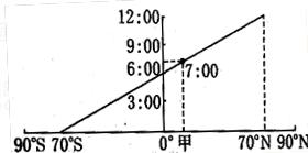 1、综合题  (10分)下图为某日120°经线上日出时刻随纬度的变化示意图,读图回答。
