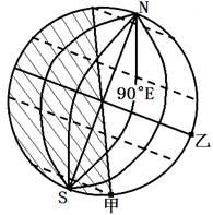 2、综合题 图为某日日照图,阴影部分为夜半球,空白部分为昼半球,虚线分别表示回归线和极圈。读图完成下列要求。(20分)