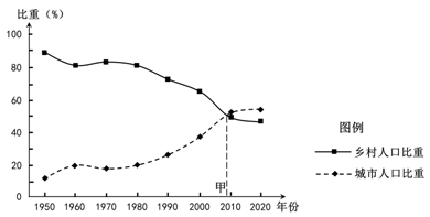 小题1:从图中城市人口比重曲线可以看出,1980—2010年城市人口比重上升的最快,所以A对。图中给出的曲线是人口比重,即农村人口或城市人口各自在总人口中所占的百分比,不能表示人口出生率的大小,所以B错。同理,在甲时间点,只能表示城市人口比重和乡村人口比重相同,不能表示城市与乡村的人口自然增长率相同,C错。城市人口比重,也就是城市化水平,是一个国家或地区经济发展水平的标志,只有经济水平提高了,城市化水平才能提高,房地产开发是随着城市发展而发展的,不是直接原因,D错。