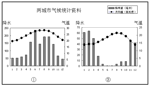 (2)根据材料二中①、②气候统计资料可知,①属于亚热带湿润气候,是丙城,②属于地中海气候,是乙城,②地夏季降水少是因为受副热带高气压控制。