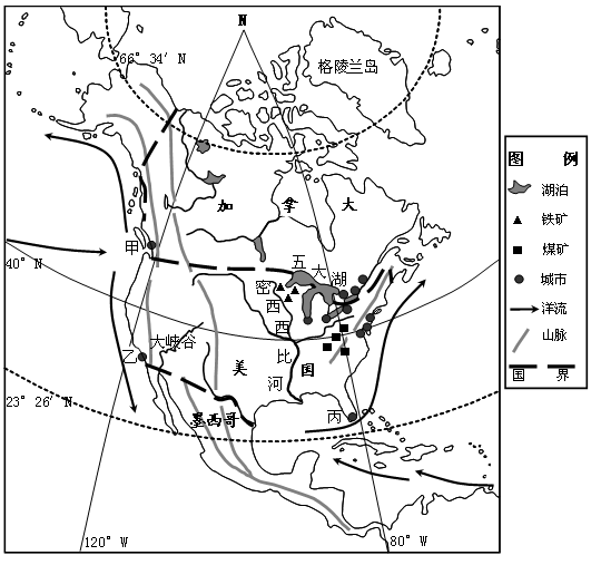 (1)根据北美区域图和所学知识可知,北美洲西部高大山脉位于板块交界处,是板块碰撞挤压形成的,抓住“上游每年4月”,可知密西西比河上游每年4月出现春汛是季节性积雪融水形成的,乙城市附近海域洋流是从高纬流向低纬,属于寒流。