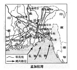 (2)从地形、河流、海岸形状、社会经济情况等方面,分析孟加拉湾风暴潮灾害严重的原因。(8分)
