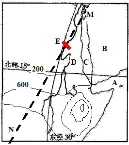 3、综合题  (16分)下图为世界某一区域简图,MN表示晨线,与30°E经线所成的角为15°,根据此图回答下列问题: