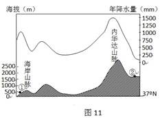 3、单选题  图11是沿37?N世界某地地形剖面及年降水量分布图,据图判断问题。